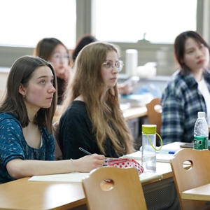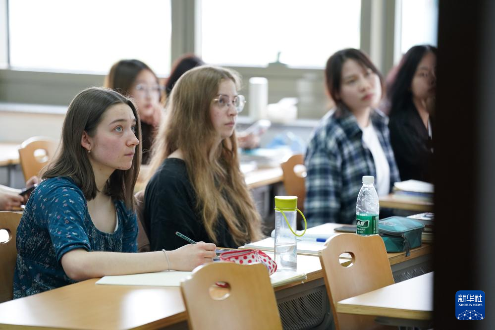 4月28日,胡灵月(左一)在北京首都师范大学校园内上课。