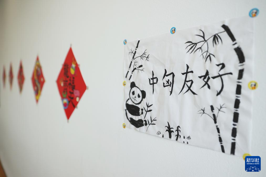 5月3日,在匈牙利布达佩斯,写有“中匈友好”的小朋友画作贴在匈中双语学校教室墙上。
