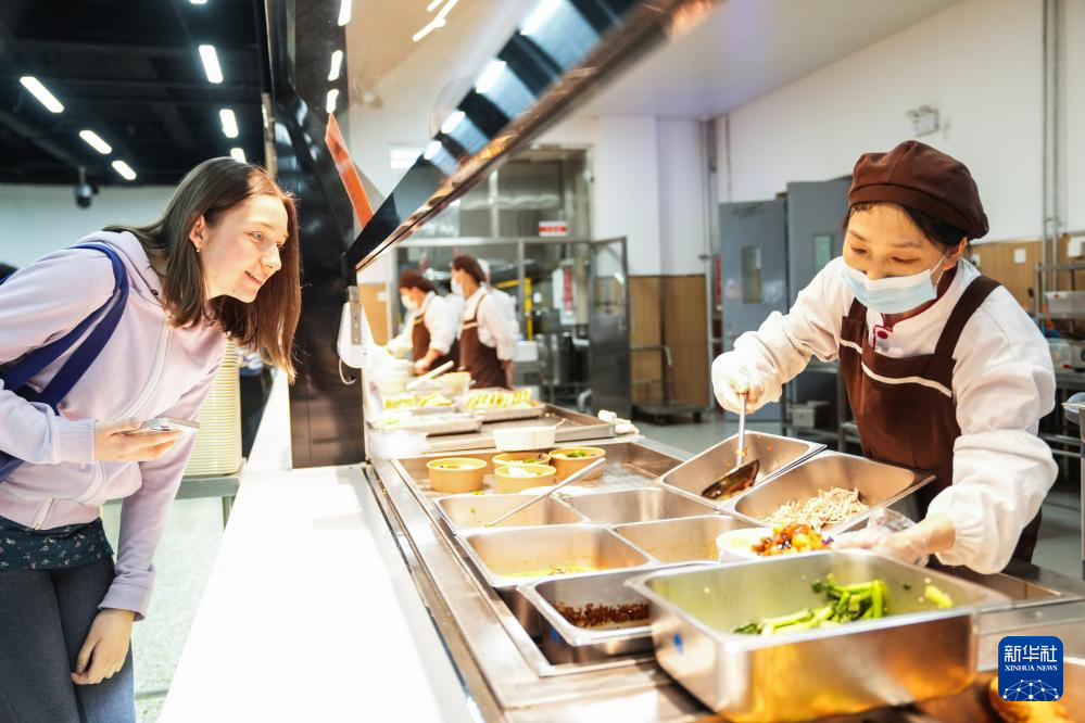 4月28日,胡灵月(左)在北京首都师范大学校园内的食堂打饭。