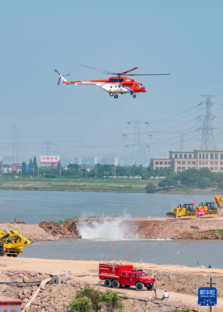5月10日,浙江金华主演习场,参演人员开展堤防决口封堵演习(无人机照片)。