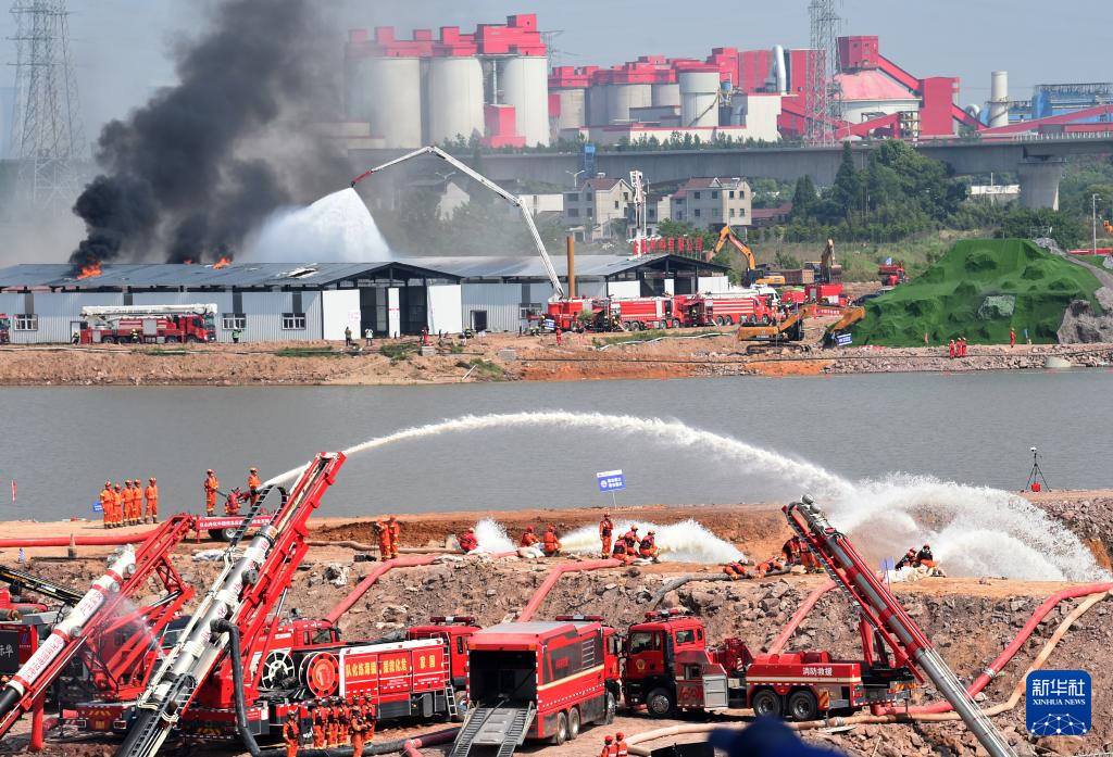 5月10日,在浙江金华主演习场,参演人员开展突发爆燃险情处置演习。