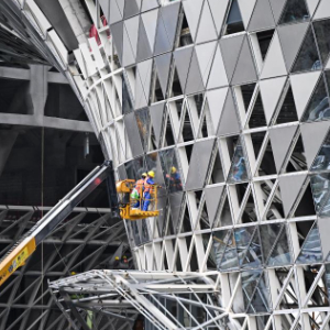 5月10日,中建深装建设者在湛江文化中心进行幕墙施工。