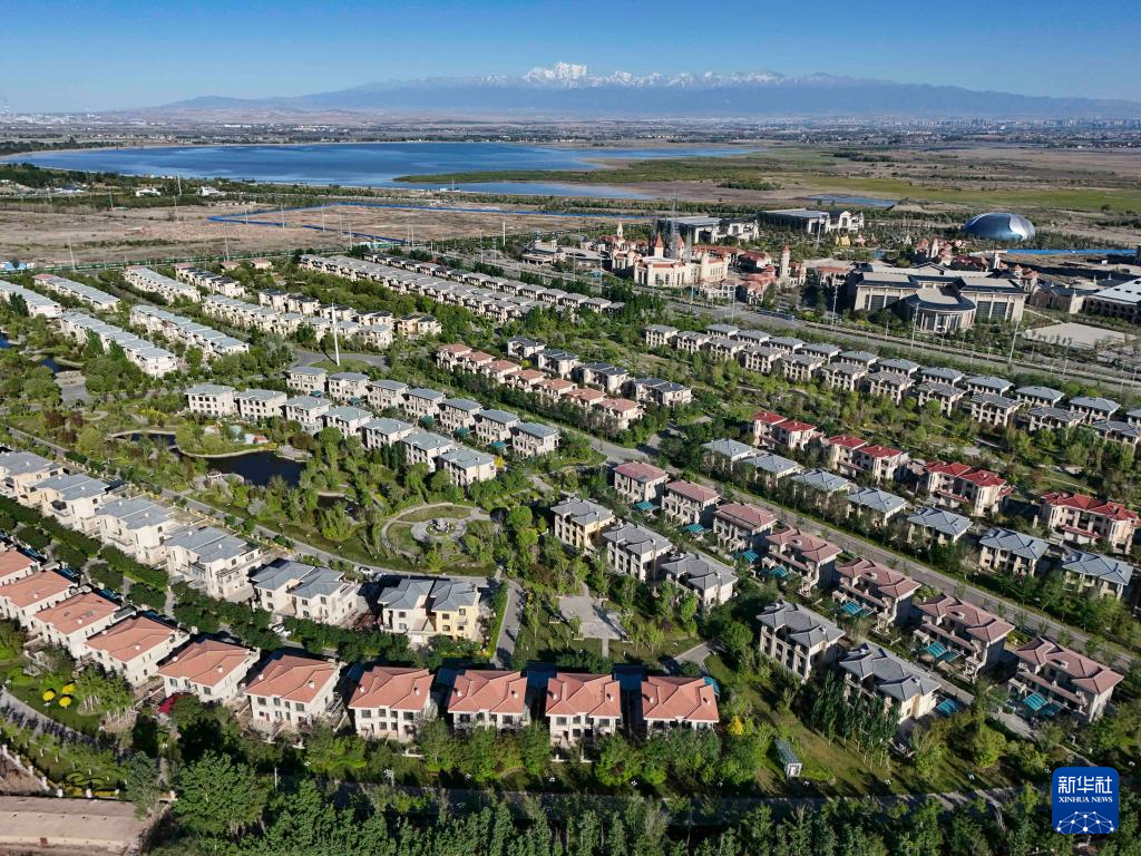 新疆生产建设兵团第六师五家渠市北海公园及周边建筑(5月9日摄,无人机照片)。 新华社记者 胡虎虎 摄