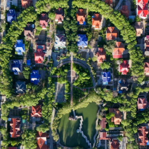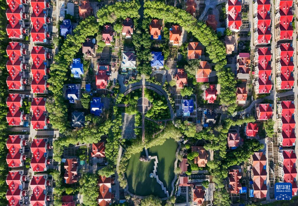 新疆生产建设兵团第六师五家渠市的一处居民区内郁郁葱葱(5月9日摄,无人机照片)。 新华社记者 胡虎虎 摄