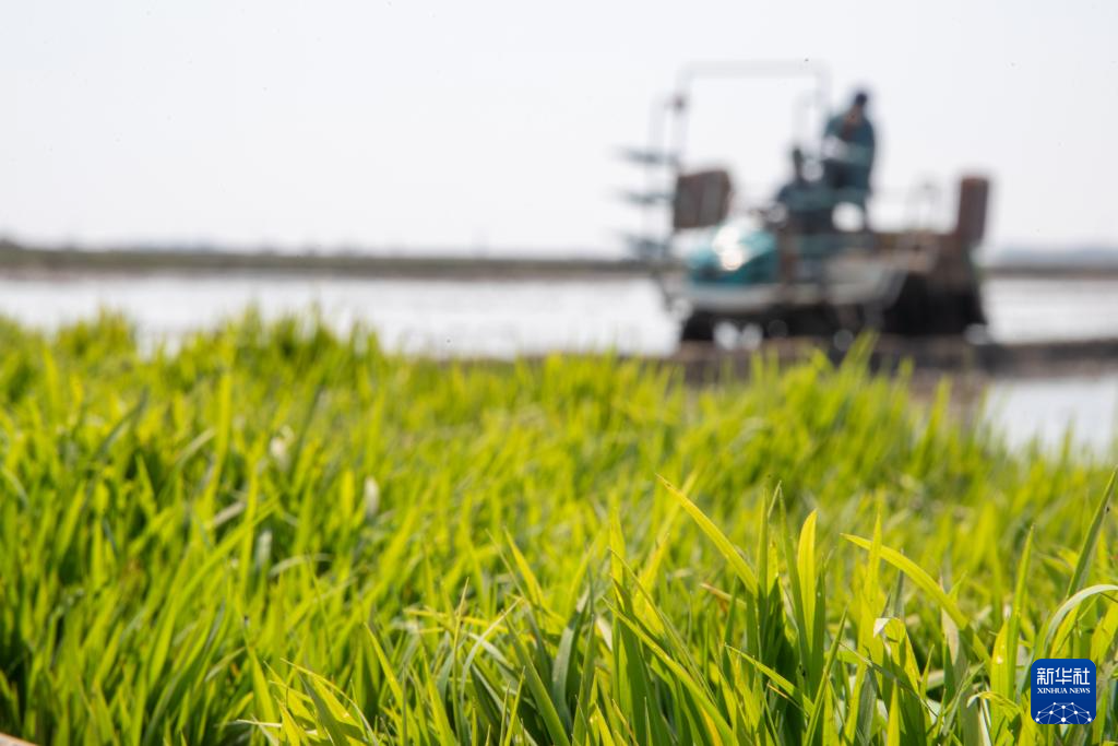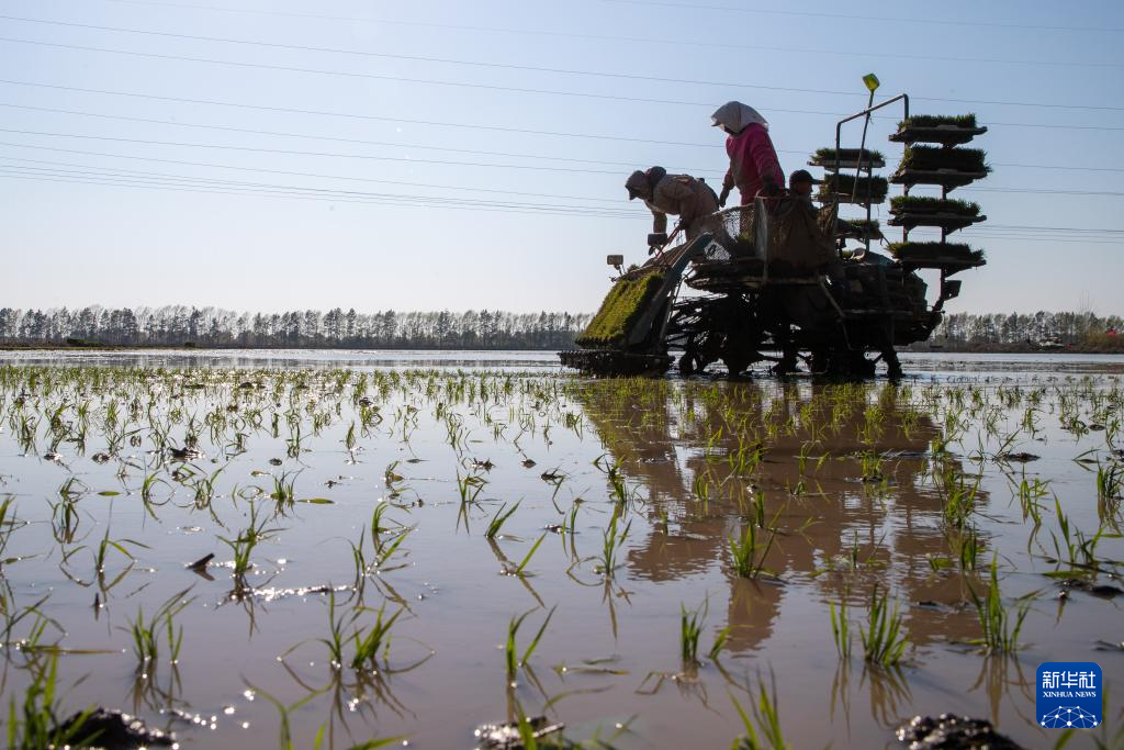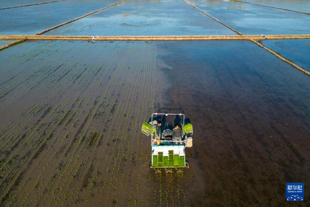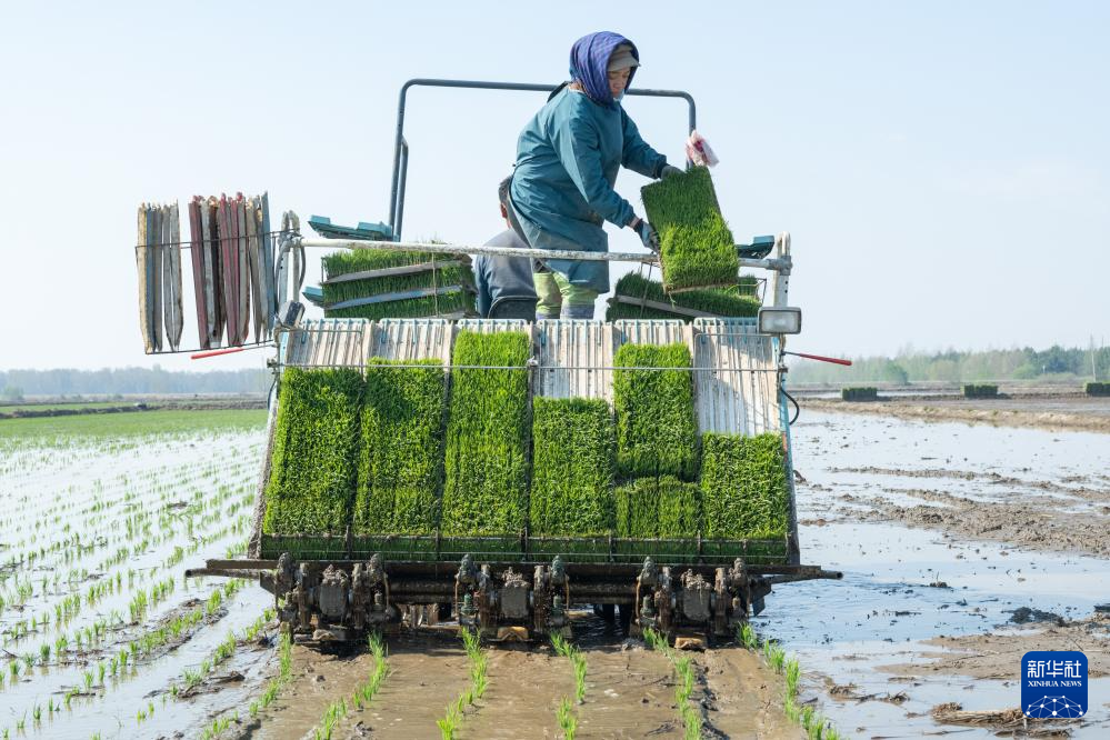 5月8日,在北大荒集团前哨农场有限公司的水田里,农民操作高速插秧机进行水稻插秧作业。