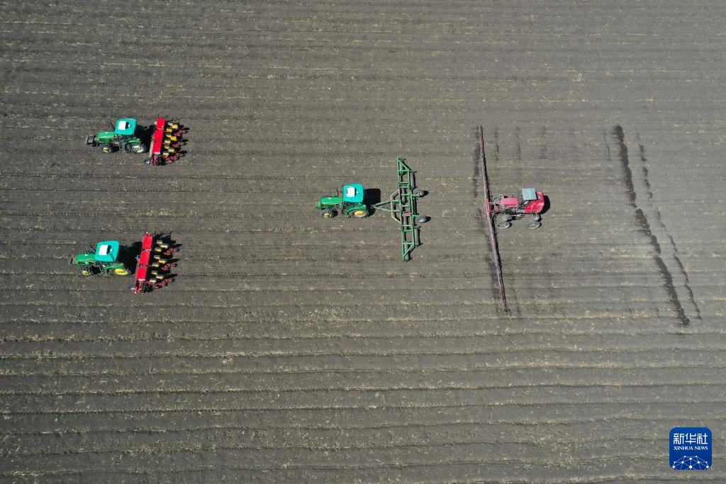 5月9日,在黑龙江北大荒农业股份有限公司友谊分公司一旱田地块,大马力农业机械在进行大豆播种作业(无人机照片)。