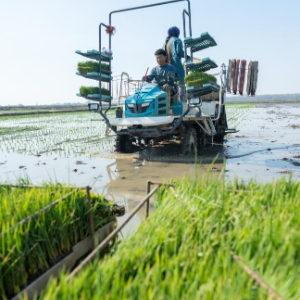 5月8日,在北大荒集团前哨农场有限公司,农民驾驶插秧机进行水稻插秧作业。