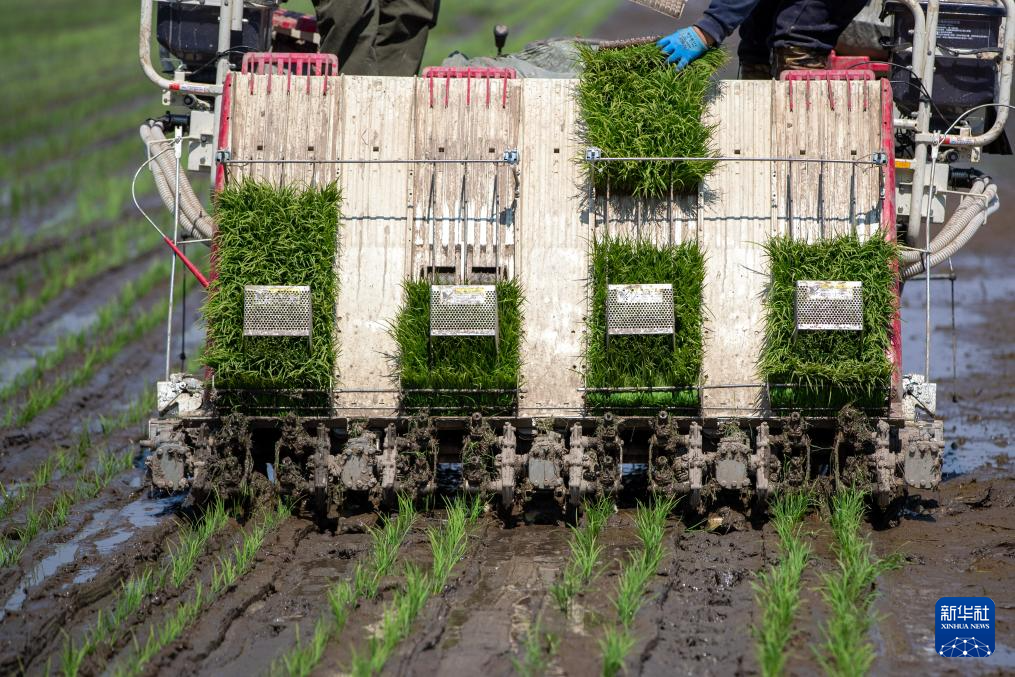 5月8日,在北大荒集团前哨农场有限公司一水田地块,农民驾驶插秧机进行水稻插秧作业。
