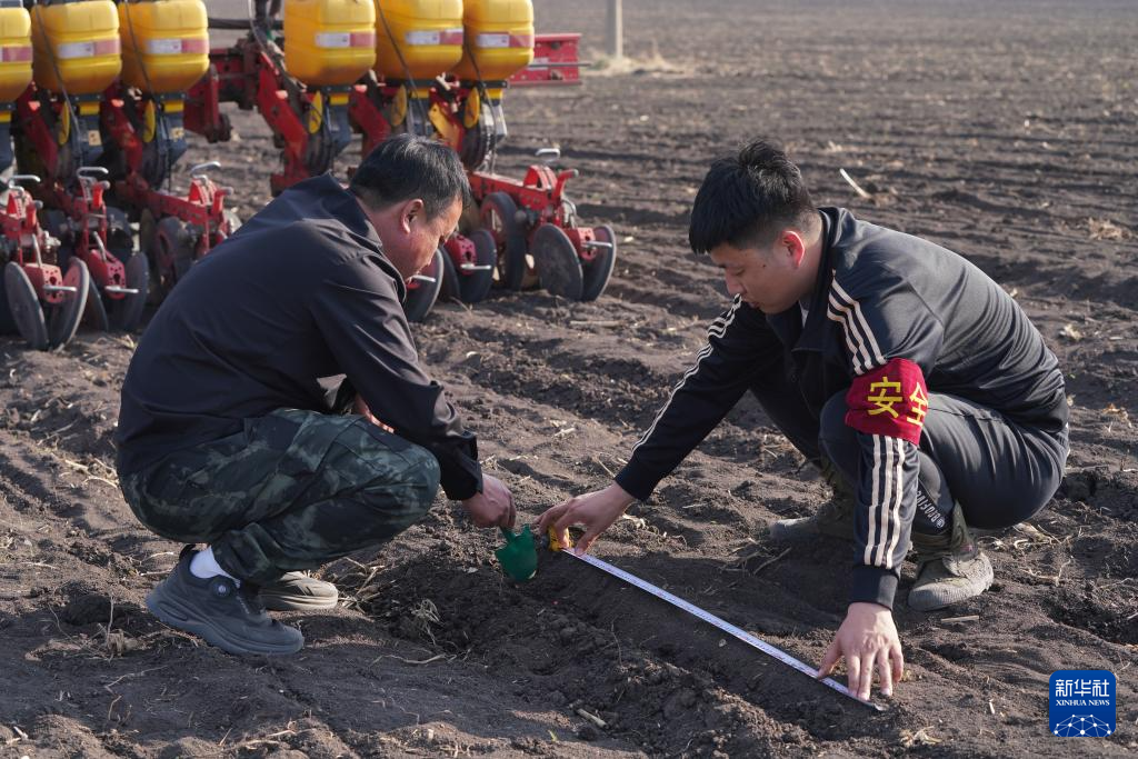 5月8日,在黑龙江北大荒农业股份有限公司友谊分公司一旱田地块,农业技术人员按照大豆种植规程要求,检查播种质量。