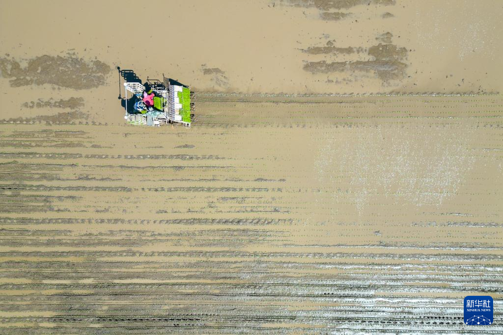 5月9日,在北大荒集团前哨农场有限公司,农民在装配有北斗导航辅助直行系统的高速插秧机上进行水稻插秧作业(无人机照片)。