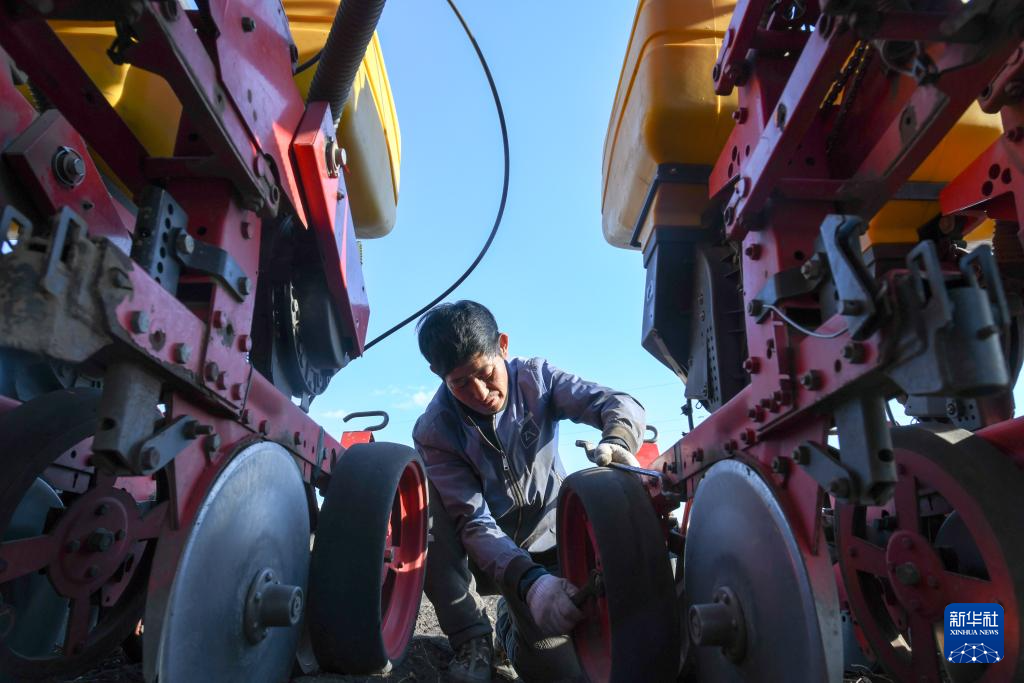 5月8日,在黑龙江北大荒农业股份有限公司友谊分公司的农机手在调整机械设备,控制大豆播种深度。
