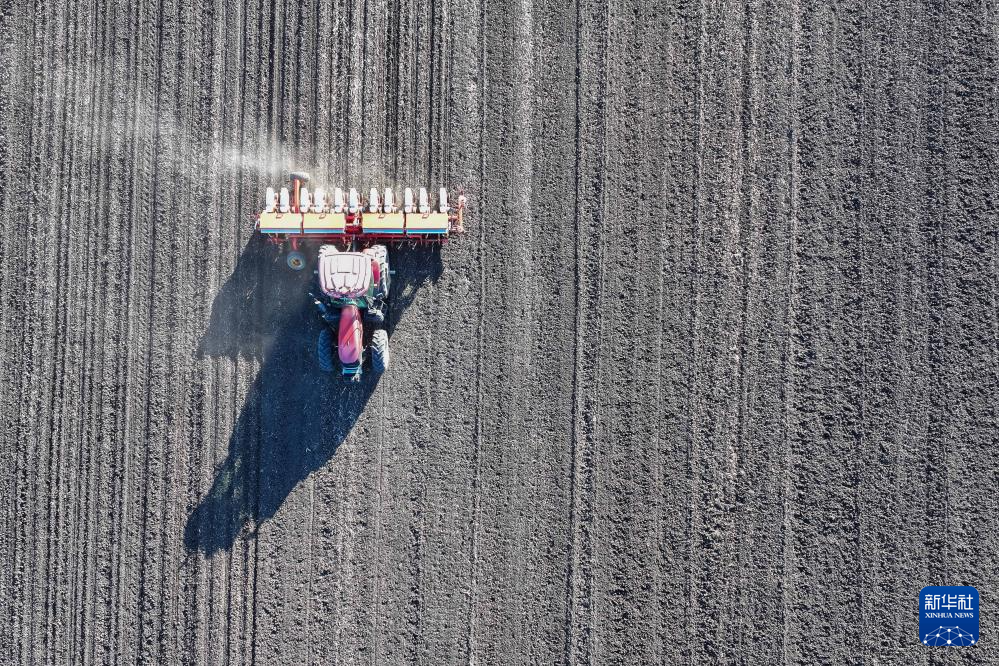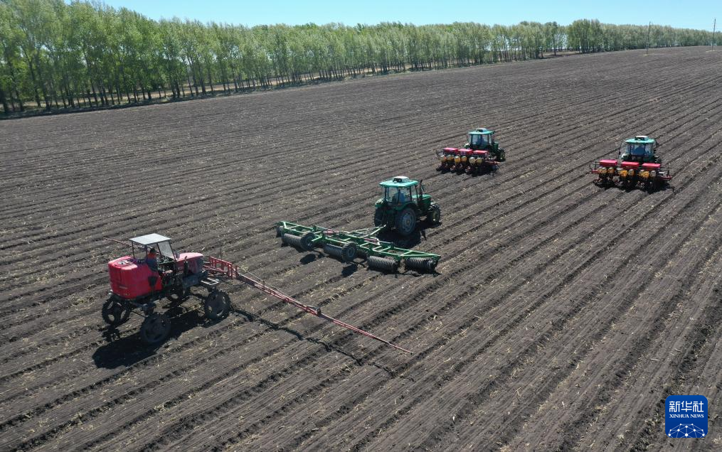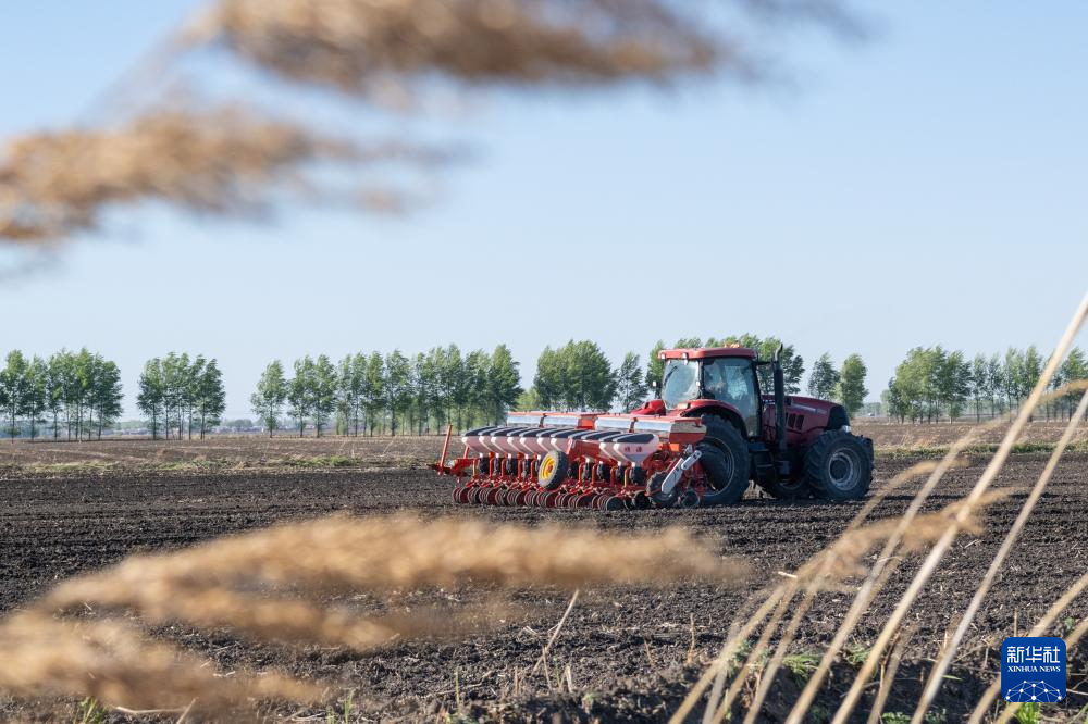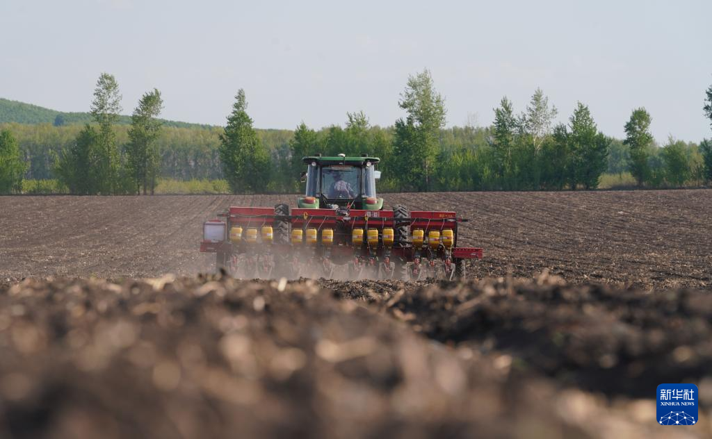 5月9日,在黑龙江省集贤县,永胜农机合作社的农民驾驶播种机播种大豆。