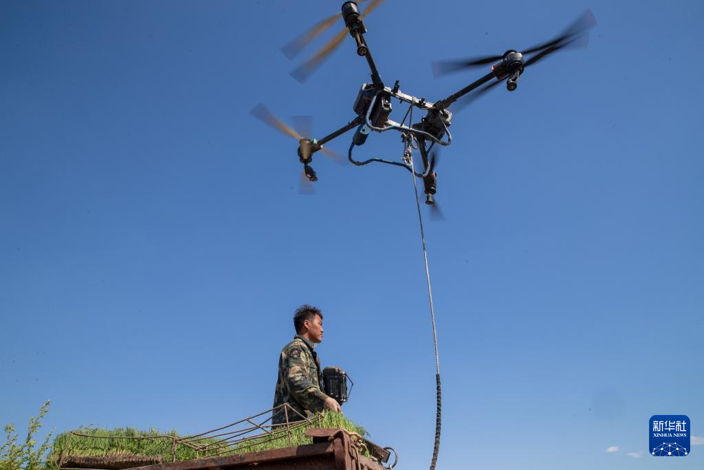 5月9日,在北大荒集团前哨农场有限公司一水田地块,无人机驾驶员准备利用无人机运送水稻秧苗。