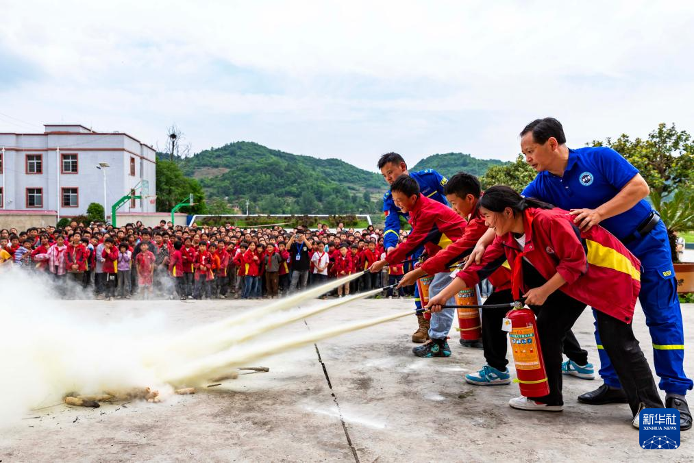 5月10日,蓝天救援队队员在贵州省黔西市锦星镇第二小学指导学生使用灭火器。