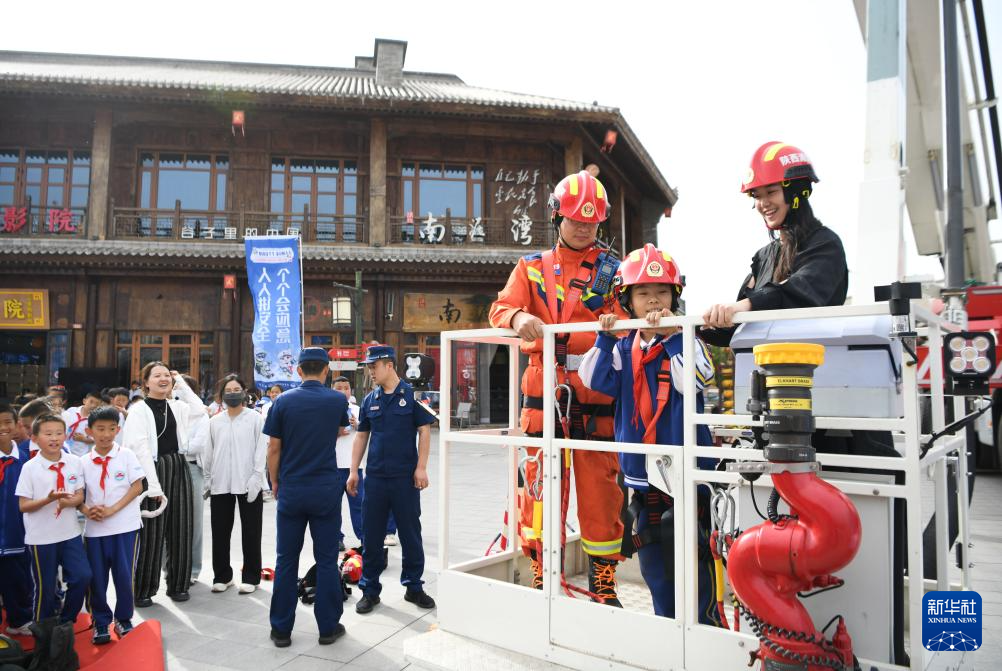 5月10日,在陕西省延安市,消防救援人员(右三)协助市民体验消防救援设备。