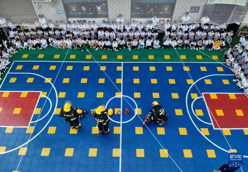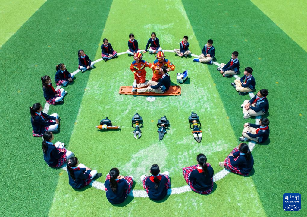 5月10日,在江苏省兴化市文峰小学,兴化市消防救援大队消防员为学生进行伤员包扎操作演示(无人机照片)。