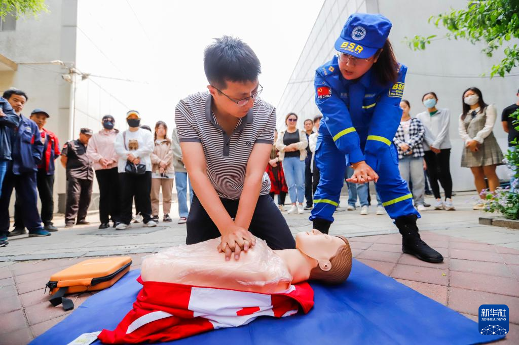 5月10日,居民在河北省遵化市文化路街道一社区练习心肺复苏技能。