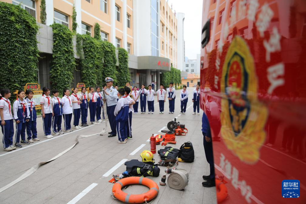 5月10日,在河北省承德市承德县实验小学,消防救援大队工作人员指导学生体验使用消防水枪。
