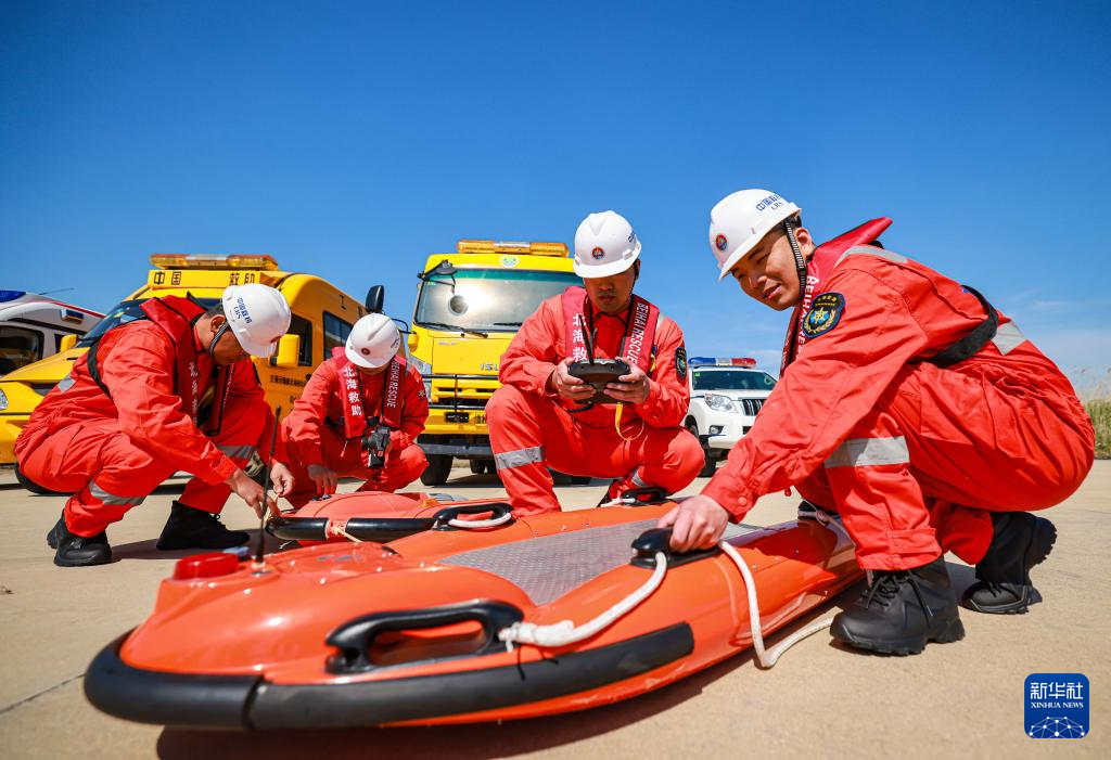 5月10日,在山东省荣成市蜊江港码头,救助基地的工作人员在熟悉水上救助机器人的操作流程等。