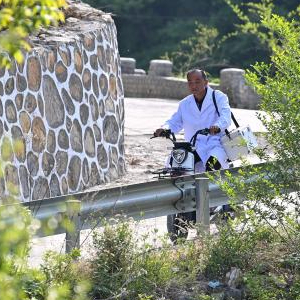 在平顺县东寺头乡七子沟村,王文吉骑电动车行驶在出诊的路上(5月8日摄)。