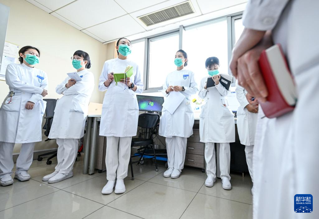5月10日,樊榕榕(左九)与医生、护士一起参加早交班。
