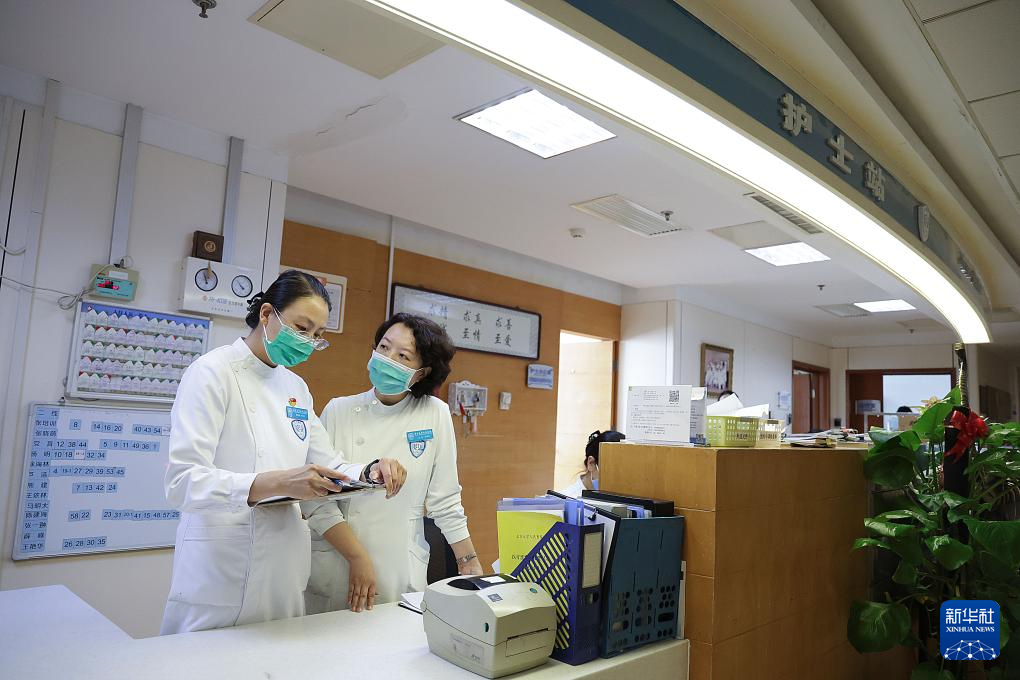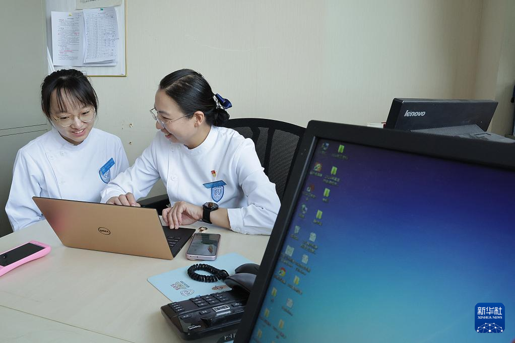 5月10日,樊榕榕(左)在骨科护士站巡视科室护理工作。