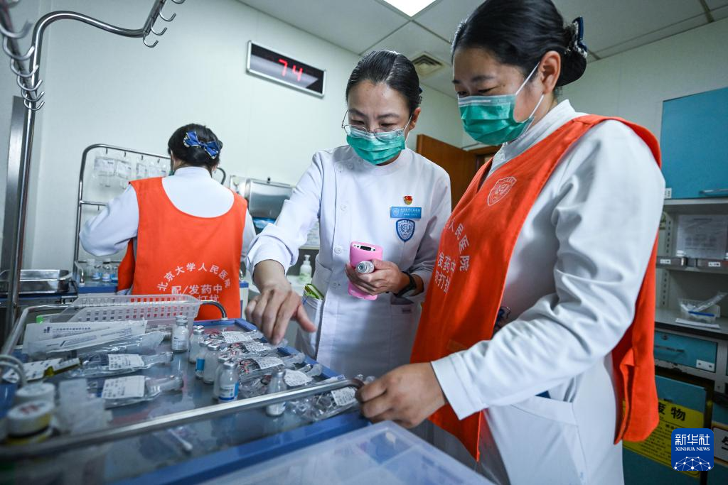 5月10日,樊榕榕(中)和同事一起配药。