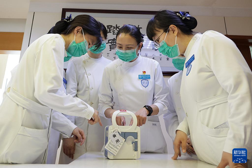 5月10日,樊榕榕(中)为护士们讲解如何使用数字化胸腔引流系统。