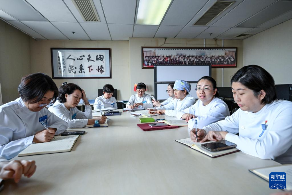 5月10日,樊榕榕(左三)在护士早交班上交待事宜。