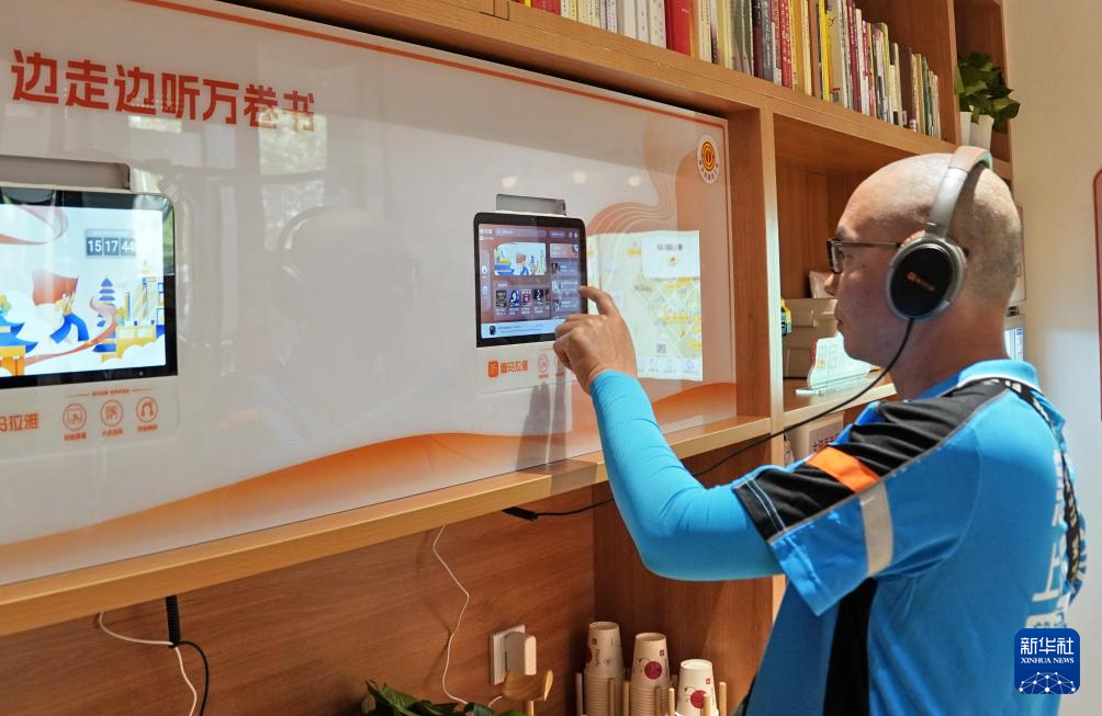 一位骑手在驿站里听书休闲(5月9日摄)。