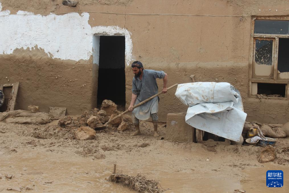 5月11日,在阿富汗巴格兰省巴格兰尼马尔卡济区,一名男子在受洪水影响的区域进行清理工作。