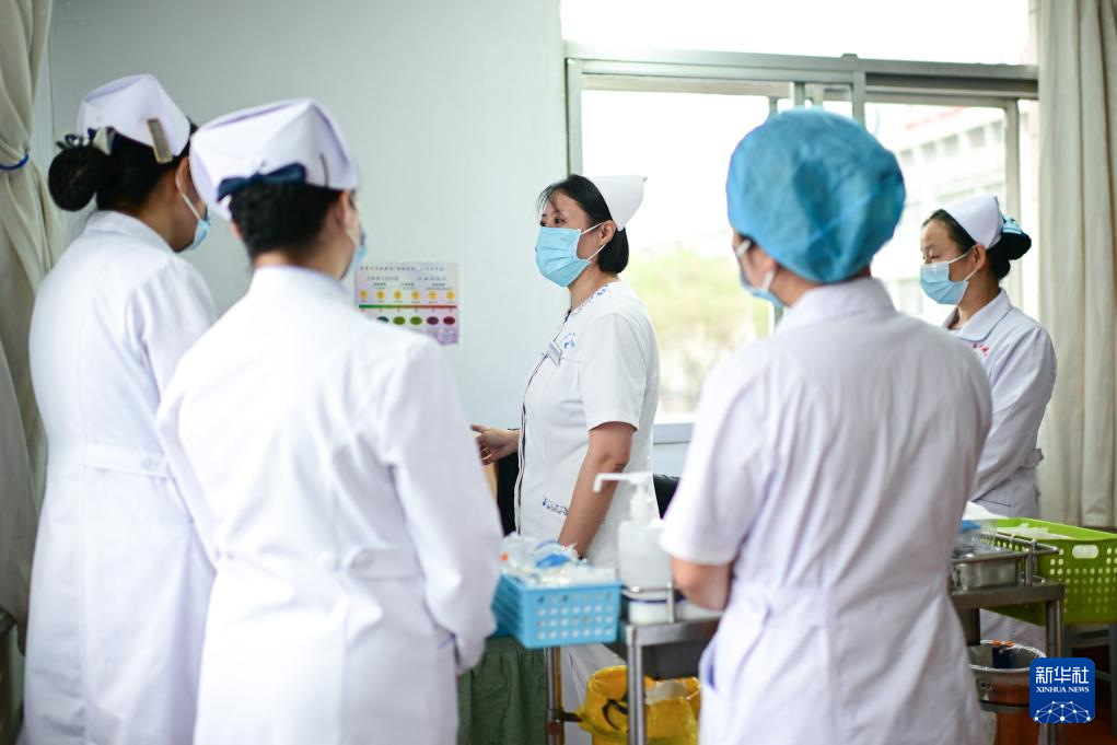 5月10日,青海省人民医院伤口造口专科护理门诊主管护师刘慧君(左三)在给年轻护士讲解伤口处理要点。