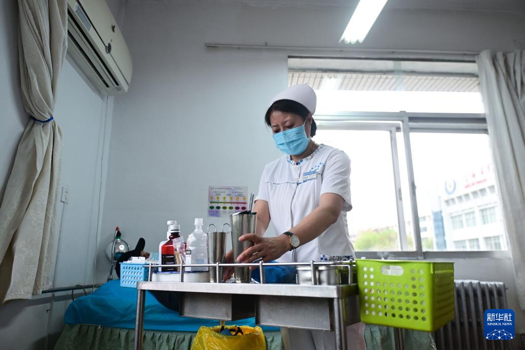 5月10日,青海省人民医院伤口造口专科护理门诊主管护师刘慧君在病房中准备处理患者伤口。