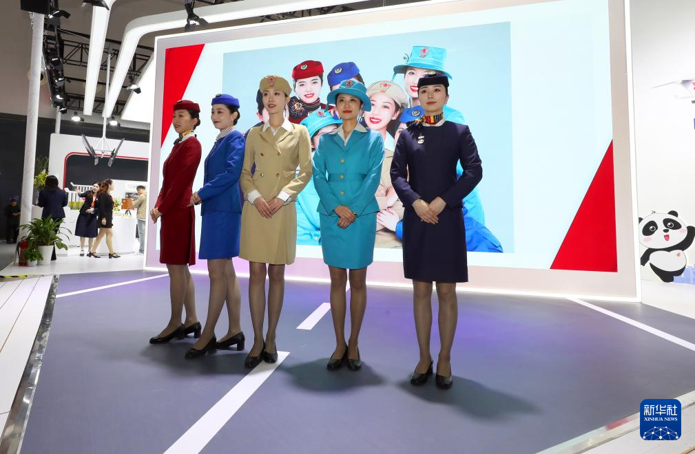 5月11日,在中国国际航空公司展台,空乘人员展示不同年代的制服。