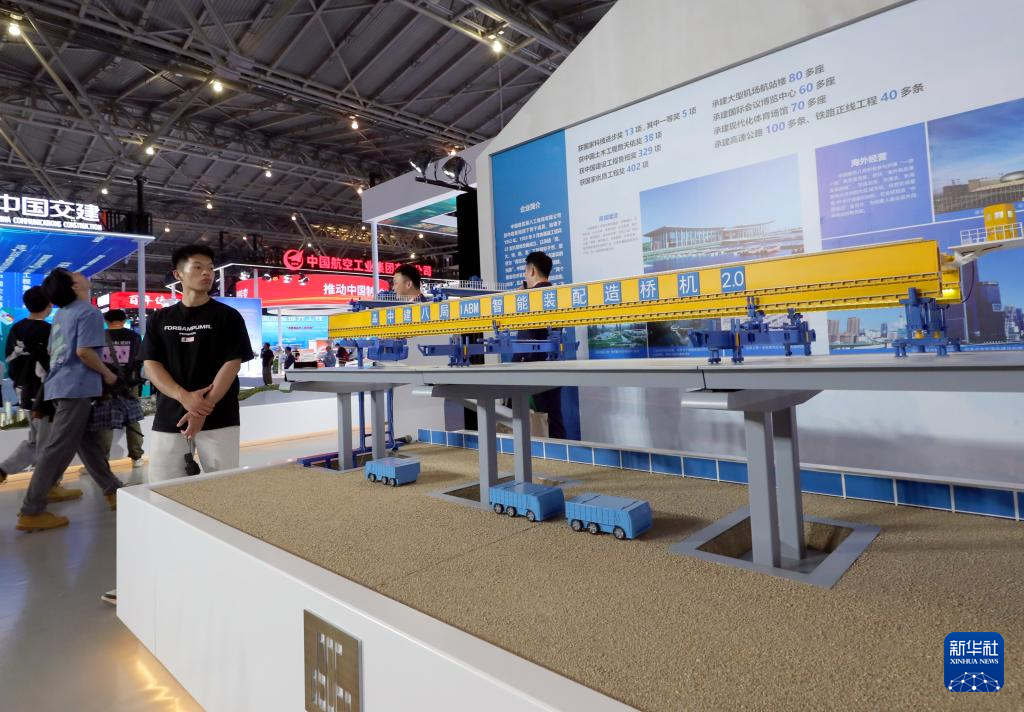 5月11日,参观者在中国建筑展台上展出的中建八局智能装配造桥机模型旁驻足观看。