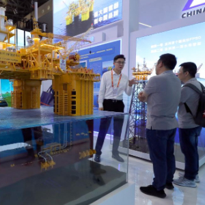 5月11日,参观者在中国海油展台上的10万吨级深水半潜式生产储油平台深海一号能源站模型展品旁交流讨论。