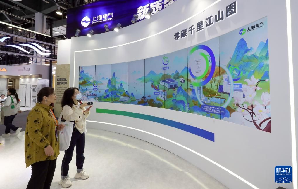 5月11日,参观者在上海电气展台的“零碳千里江山图”上查看企业低碳环保成果。