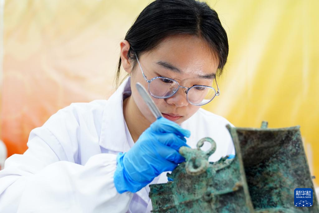 5月11日,在济南舜耕国际会展中心,莱芜职业技术学院的学生在现场演示文物修复技艺。