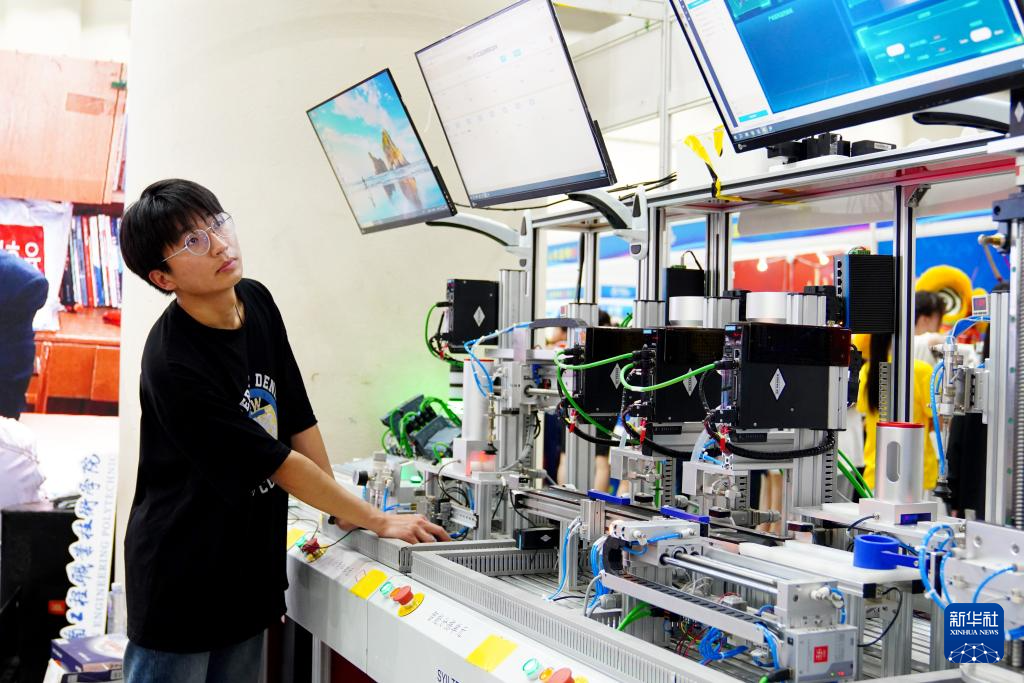 5月11日,在济南舜耕国际会展中心,济南工程职业技术学院的同学在展示颗粒灌装生产线。