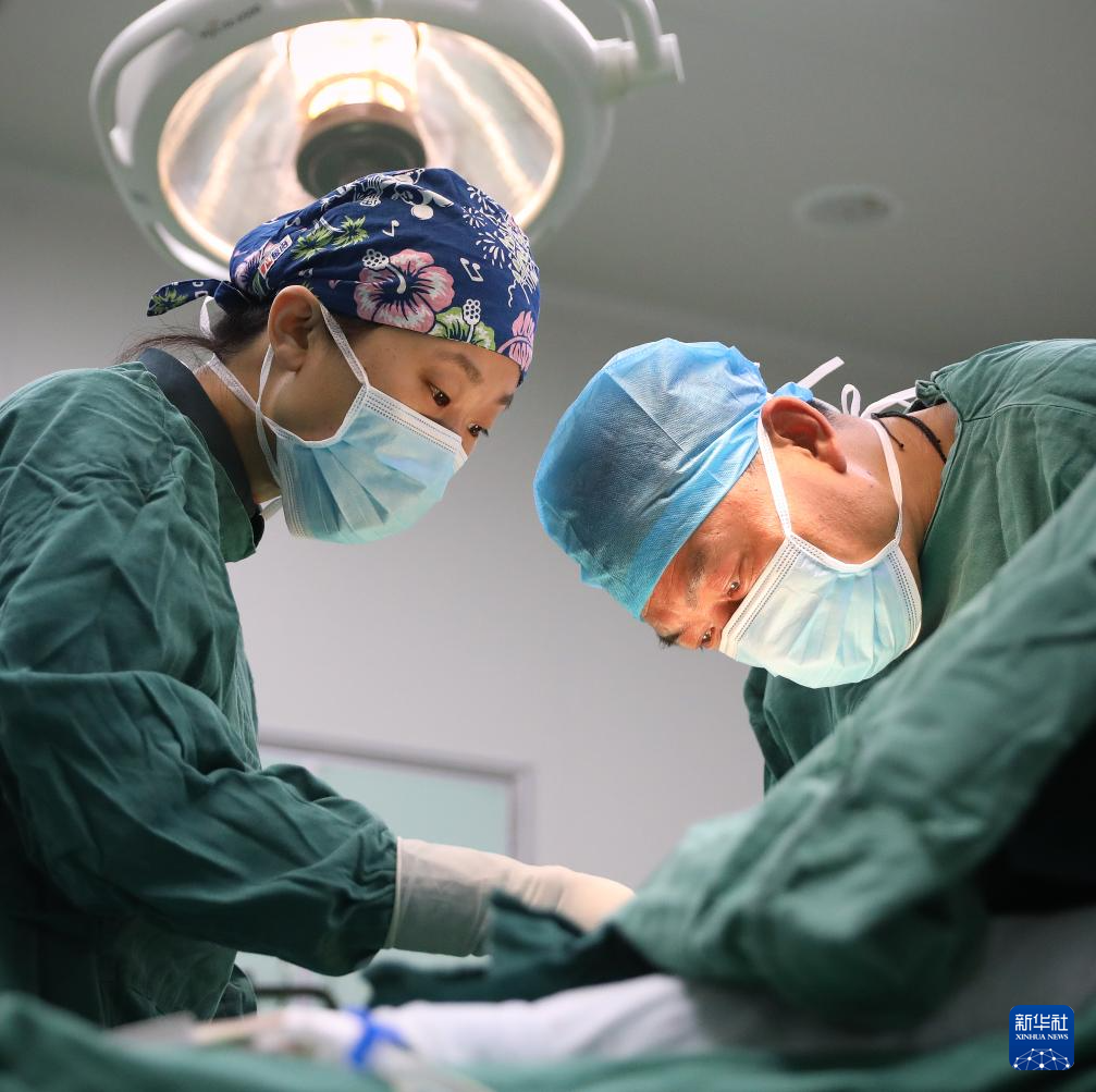 5月9日,董永鑫(左)在恩良医院手术室手术间内辅助医生唐海龙手术。新华社记者 姚剑锋 摄