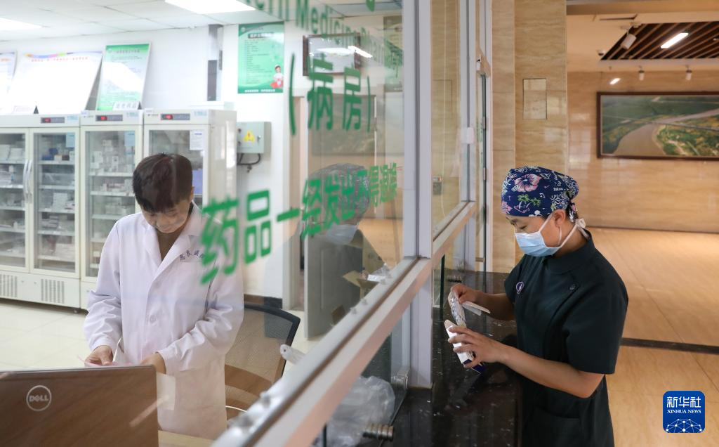 5月8日,董永鑫(右)在恩良医院内科病房药局取药并核对药品。新华社记者 姚剑锋 摄pagebreak