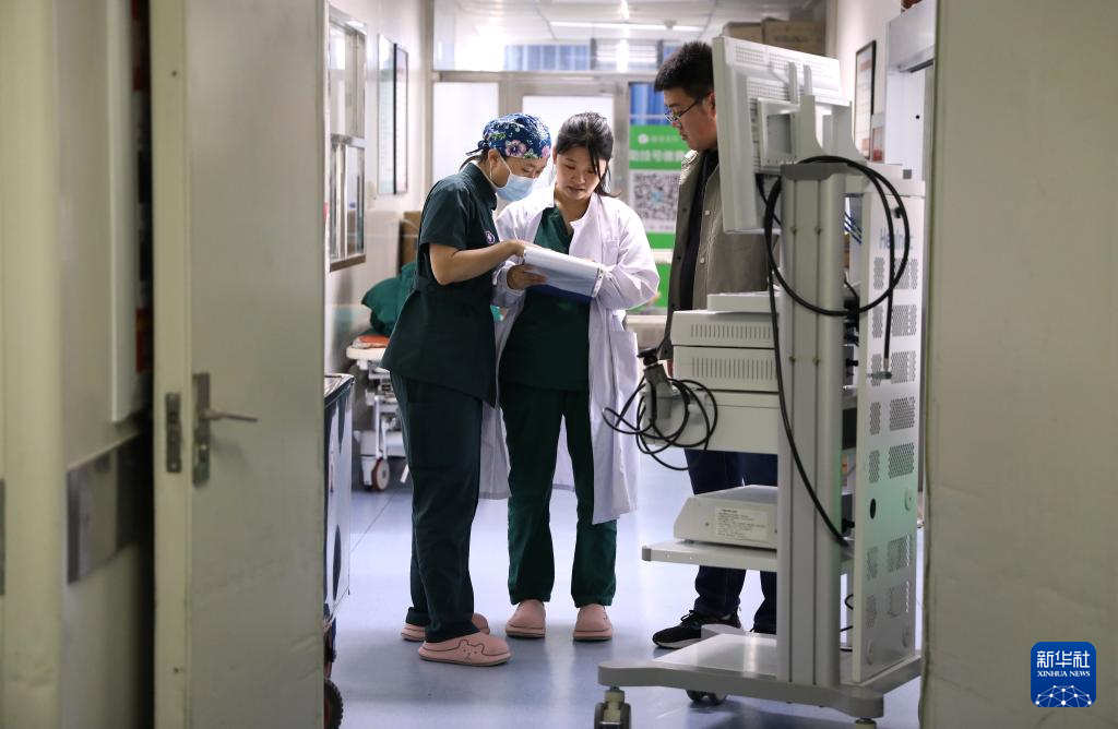 5月8日,董永鑫(左一)和手术室护士陈晓凤(中)在恩良医院手术室走廊里核对手术设备。新华社记者 姚剑锋 摄pagebreak