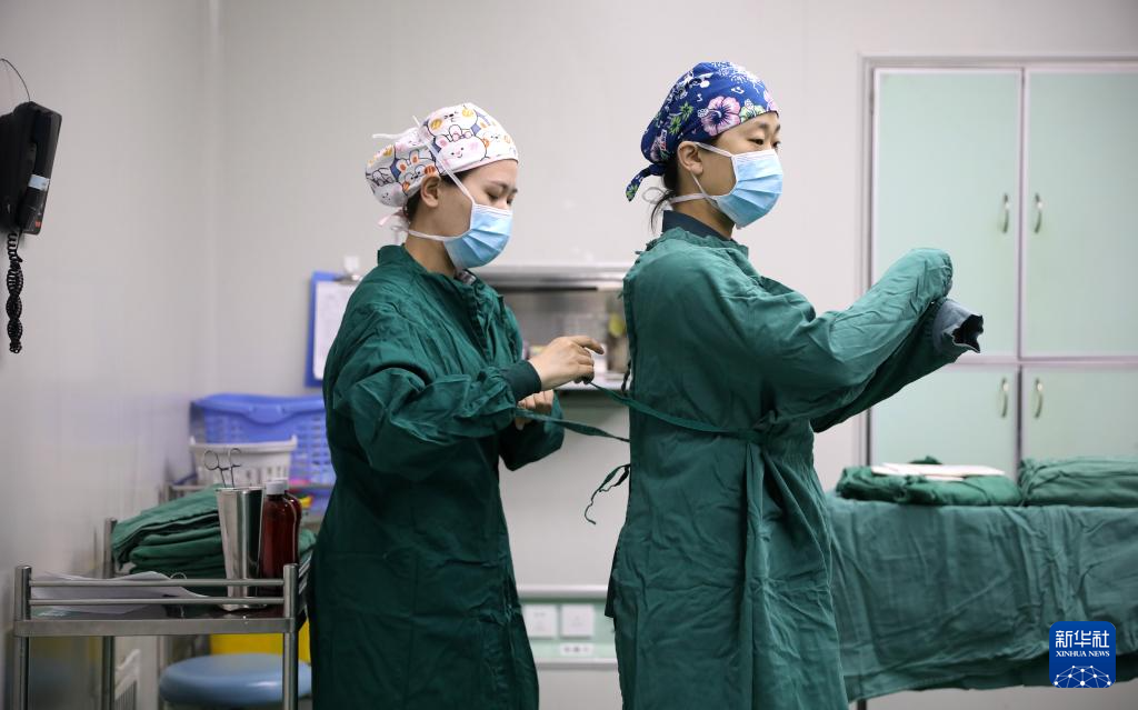 5月9日,手术室护士张晶(左)在恩良医院手术室手术间内为董永鑫系上手术衣。新华社记者 姚剑锋 摄pagebreak