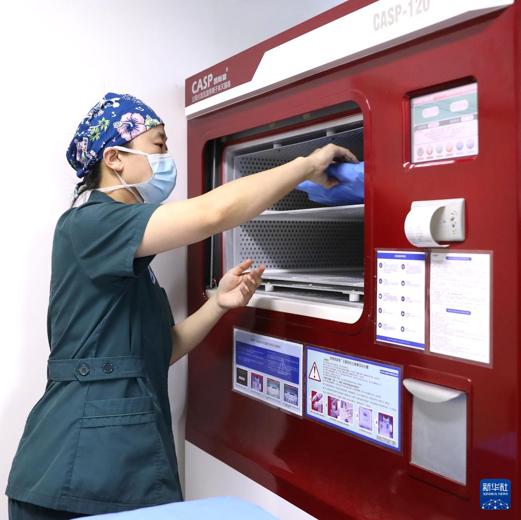 5月8日,董永鑫从恩良医院手术室低温等离子灭菌机内拿出灭菌后的器械包。新华社记者 姚剑锋 摄pagebreak