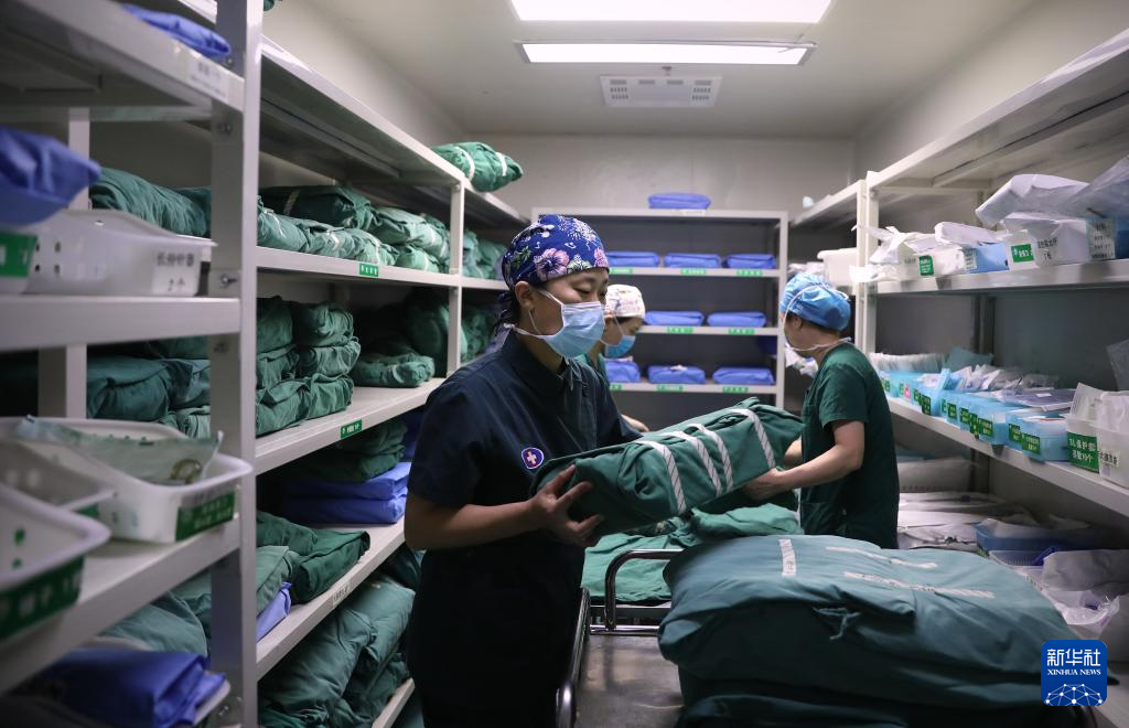 5月8日,董永鑫(左前)和同事们在恩良医院手术室备品间整理摆放消毒后的器械。新华社记者 姚剑锋 摄pagebreak