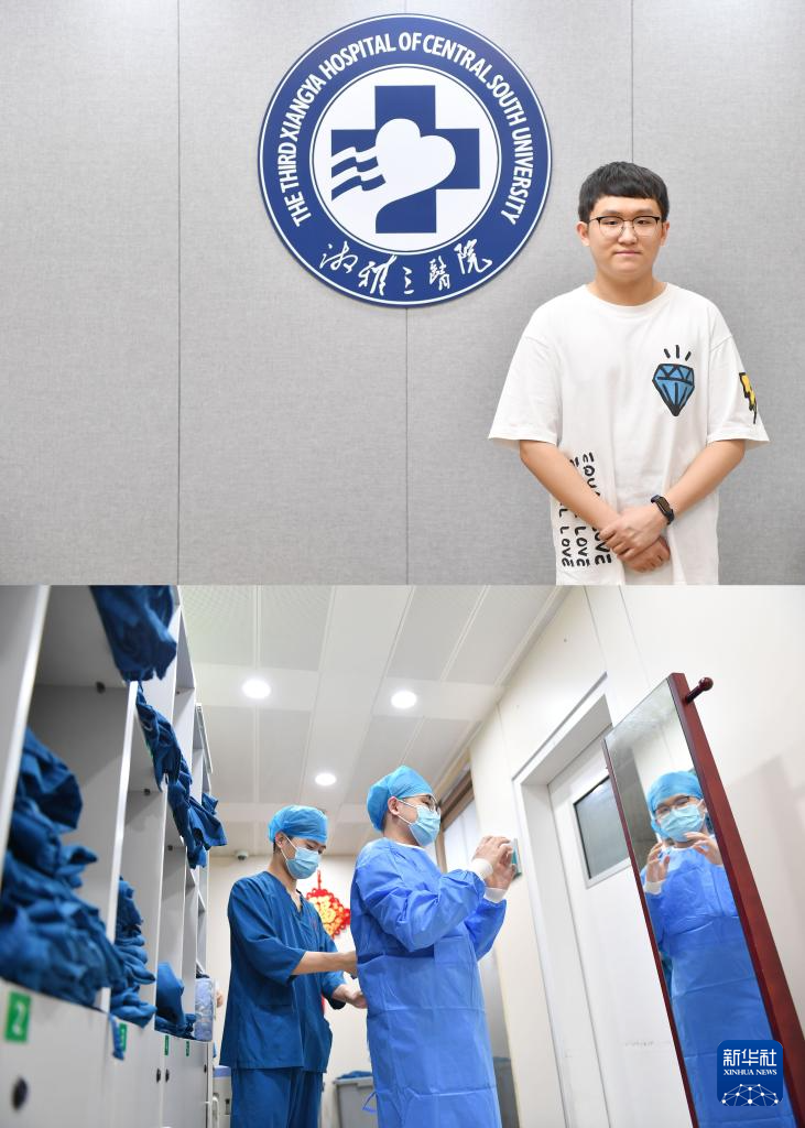 这是一张拼版照片:上图为欧阳云峰肖像(2024年5月9日摄);下图为2024年5月9日,中南大学湘雅三医院重症医学科护士欧阳云峰(右)在同事郑昊义协助下穿护理服。