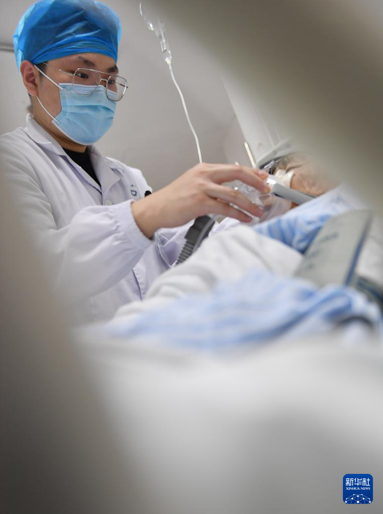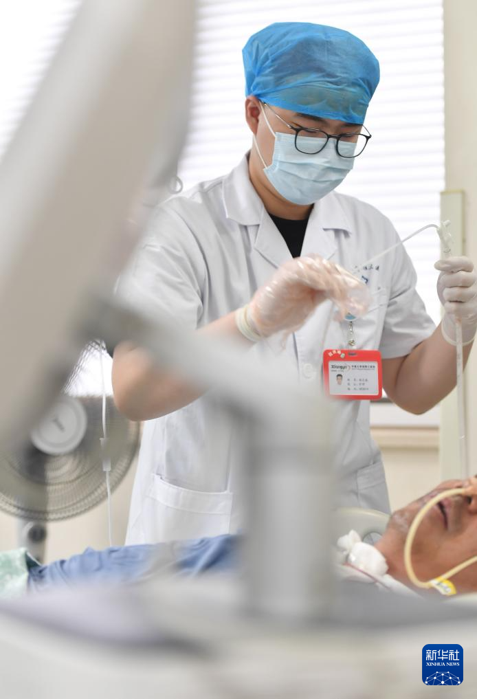 5月10日,郝志威在神经外科重症监护室为气管切开病人进行吸痰护理。