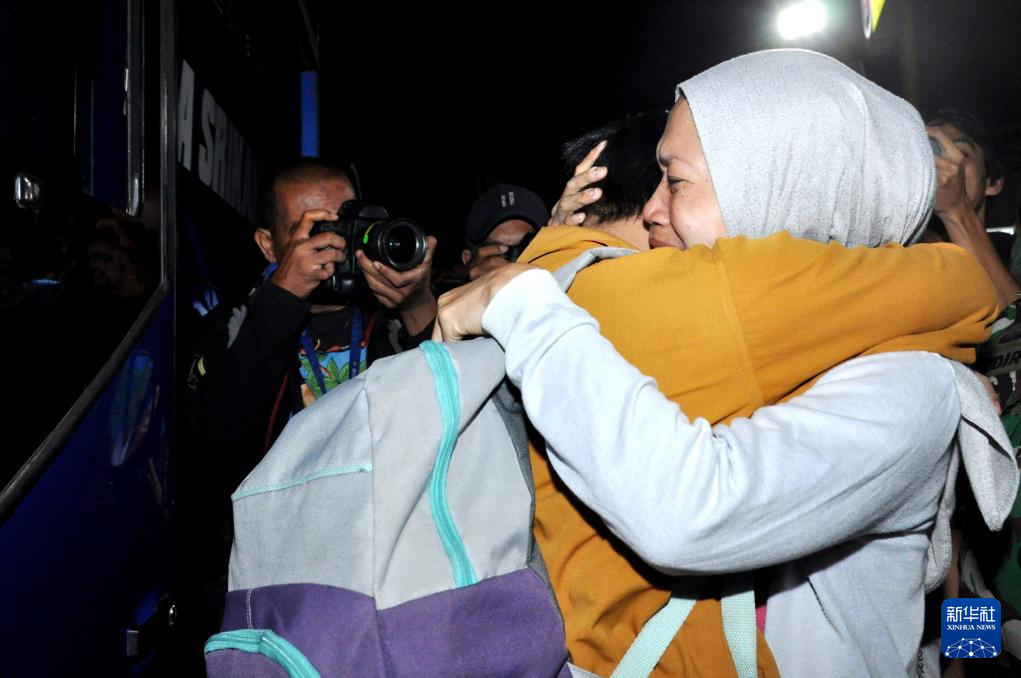 5月12日凌晨,大巴车侧翻事故幸存者抵达印度尼西亚西爪哇省德波后与亲人拥抱。