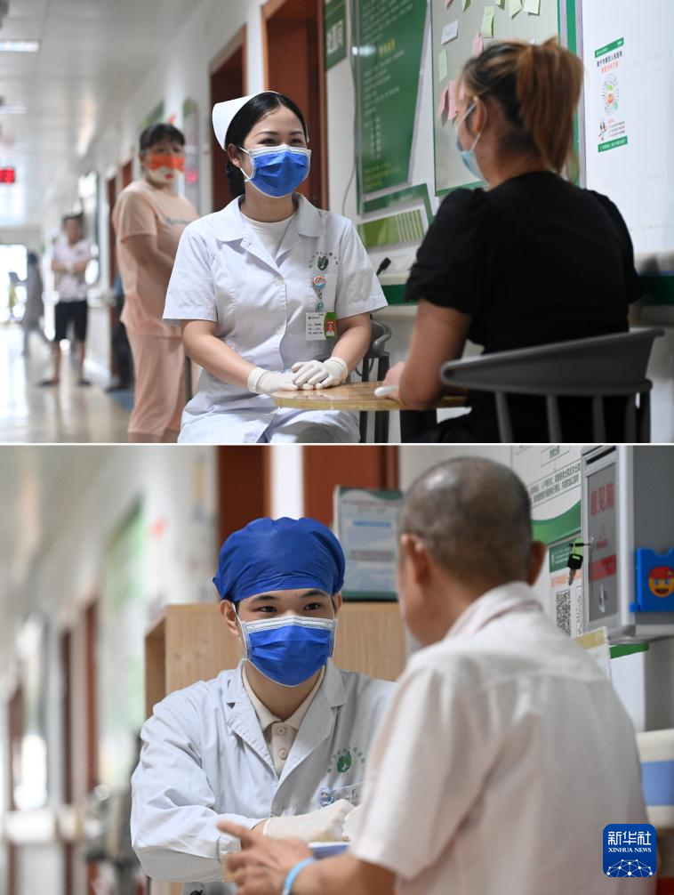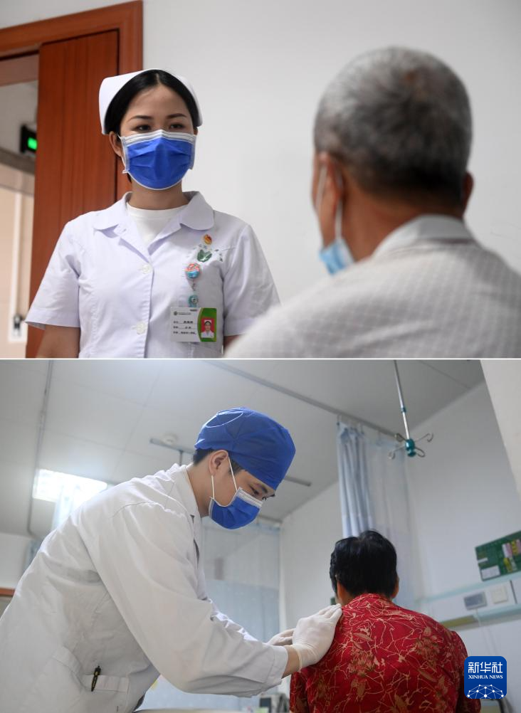 这是一张拼版照片。5月11日,在广西南宁市第四人民医院,吴雅静(上图)在和病人交流,杨江华(下图)在给病人按摩。