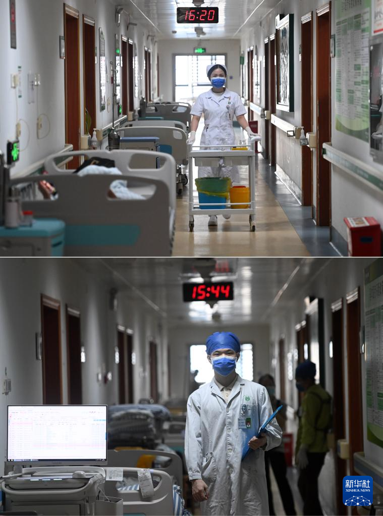 这是一张拼版照片。5月11日,在广西南宁市第四人民医院,吴雅静(上图)、杨江华(下图)走在病房走廊里。